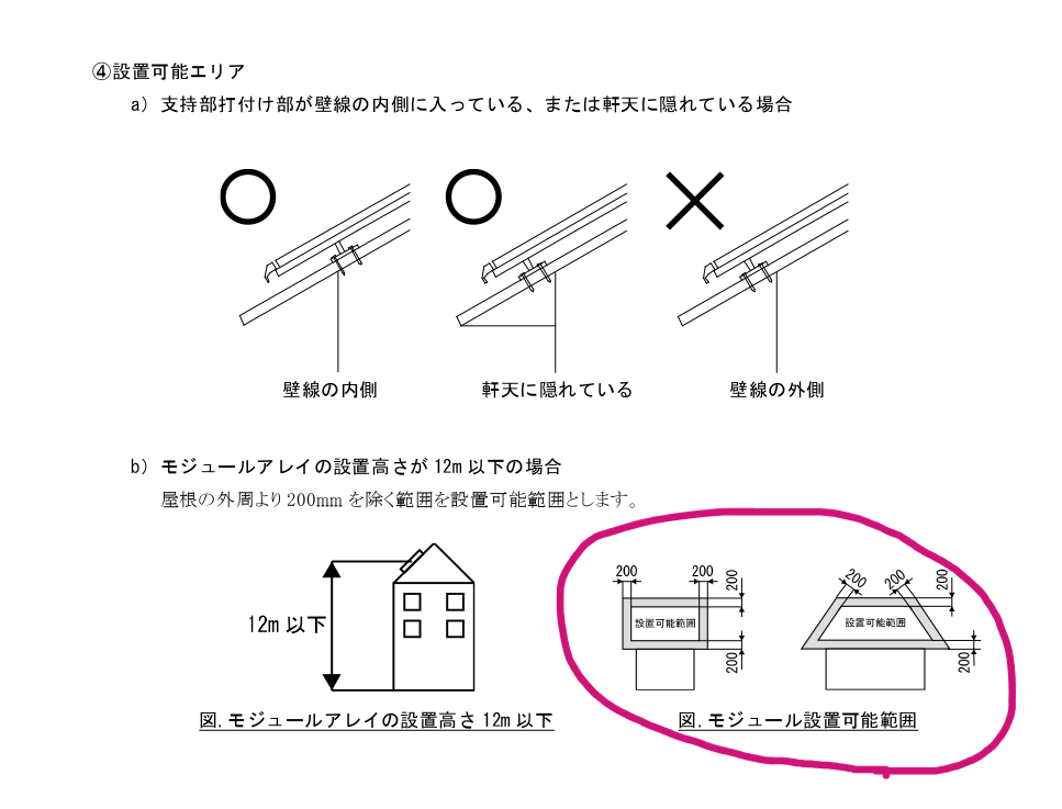 しかし、今回の写真の施工例では、軒先から200mm~300mmの離隔が確保されておらず、基準を満たしていない状態となっています。