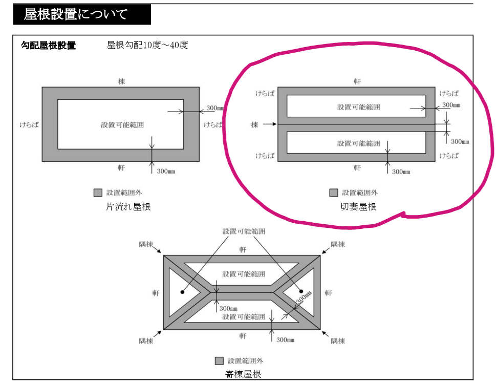 太陽光パネルを設置する際には、例外を除いて屋根の軒先や棟からそれぞれ200mm~300mm以上の離隔を確保しなければなりません。